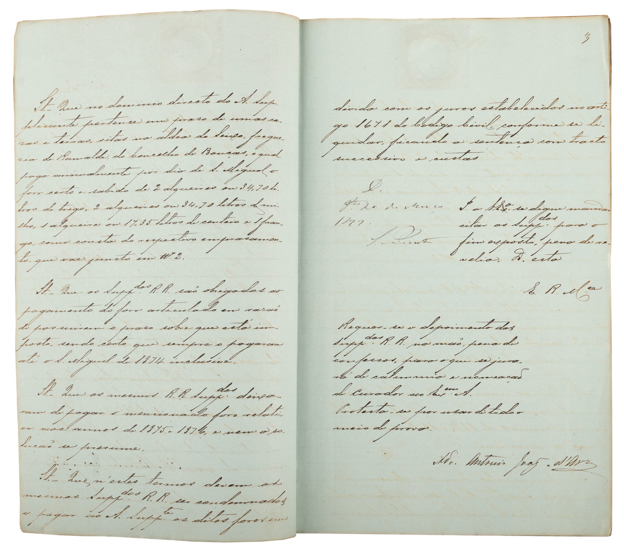 Proceso judicial de demanda de rentas, en el que el demandante es João de Lencastre e Távora, representado por su tutor, y, los demandados Manuel Martins y su esposa. El proceso judicial se basa en la falta de pago de la renta —2 fanegas o 34,10 litros de trigo, 2 fanegas o 34,10 litros de maíz, 1 fanega o 17,35 litros de centeno— relativo a un plazo de una de las casas y tierras del pueblo de Seixo, parroquia de Ramalde, municipio de Bouças.