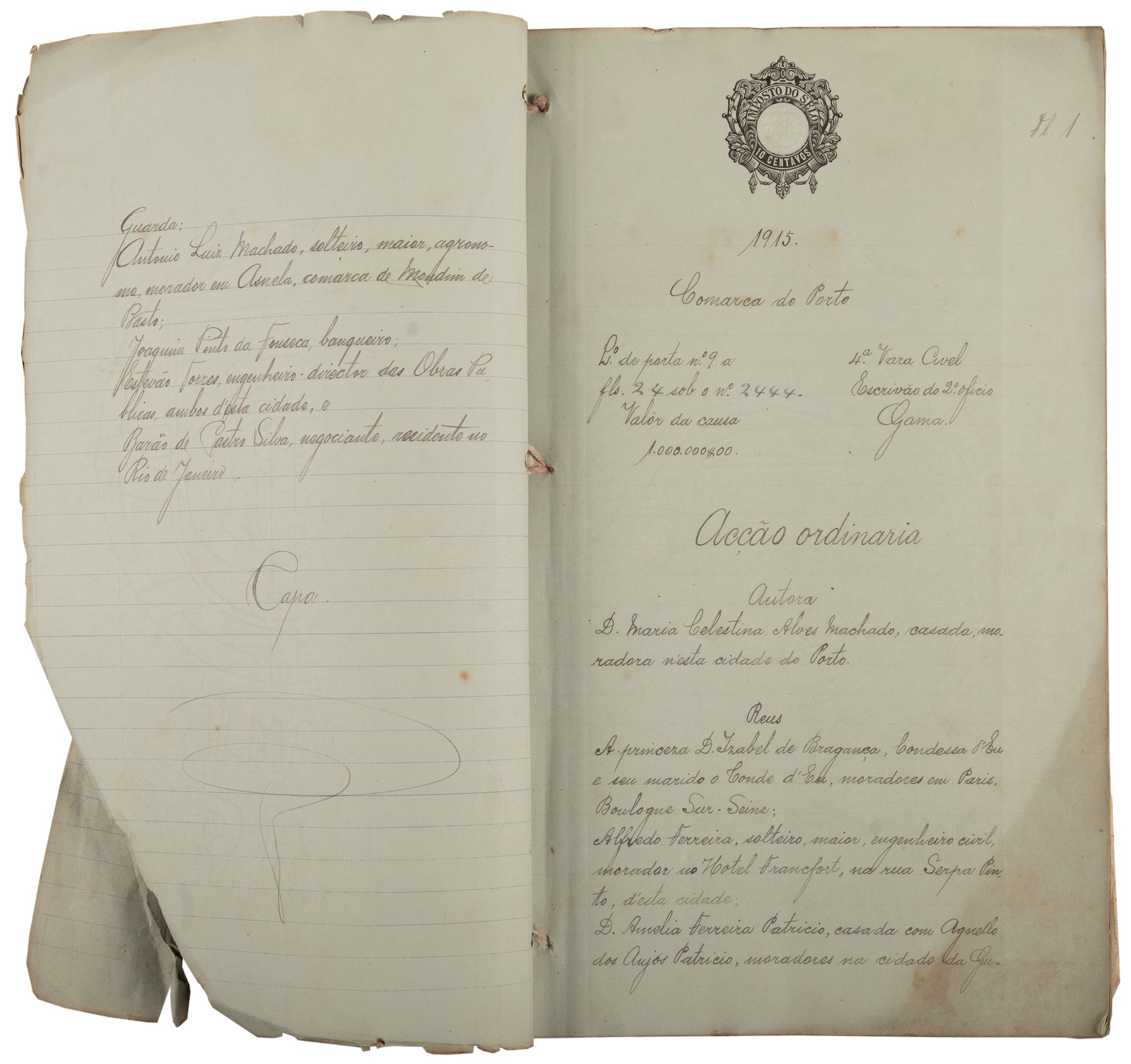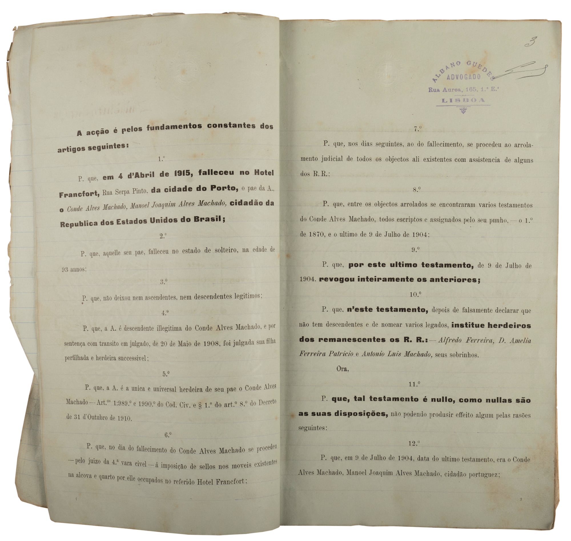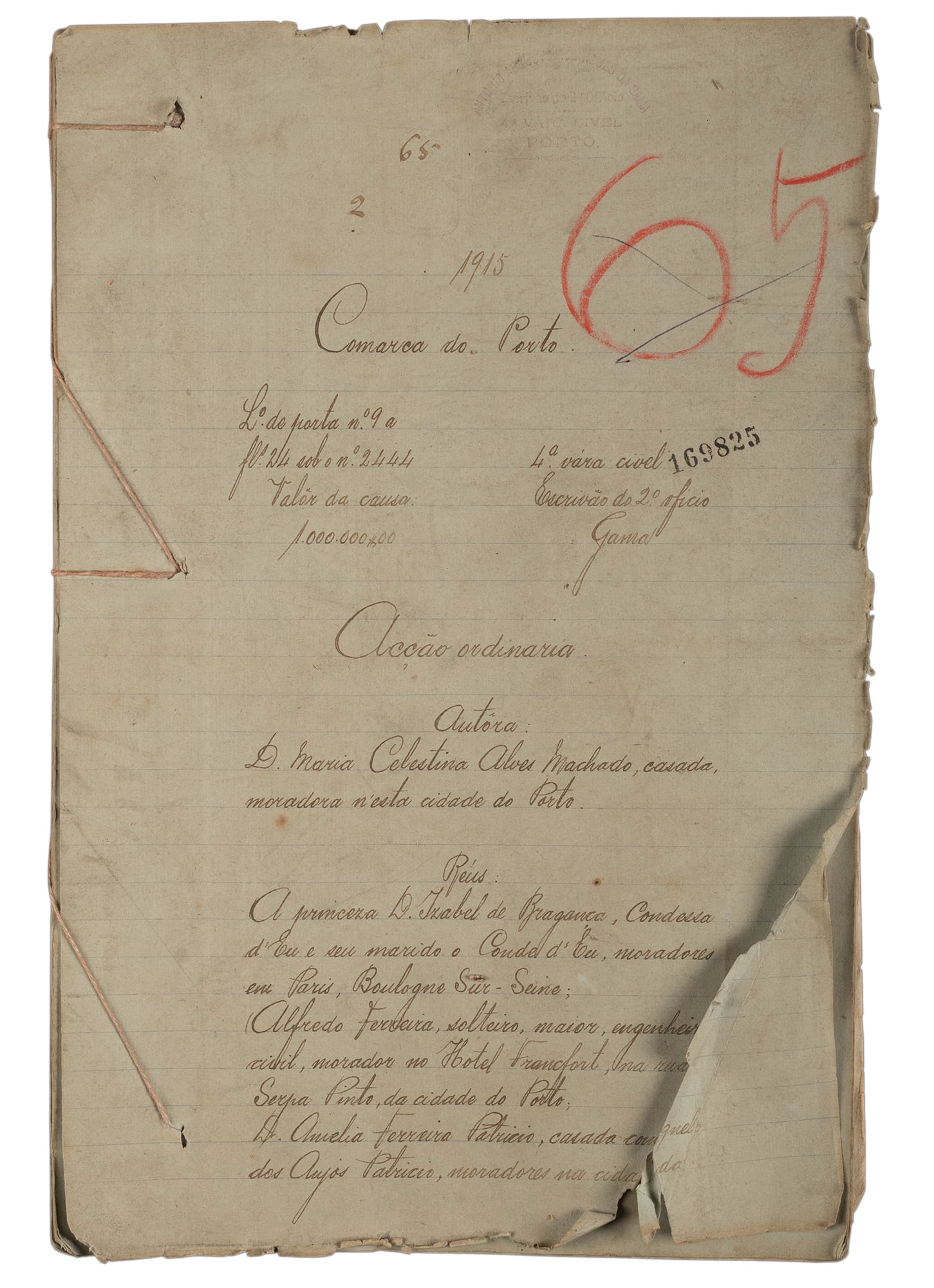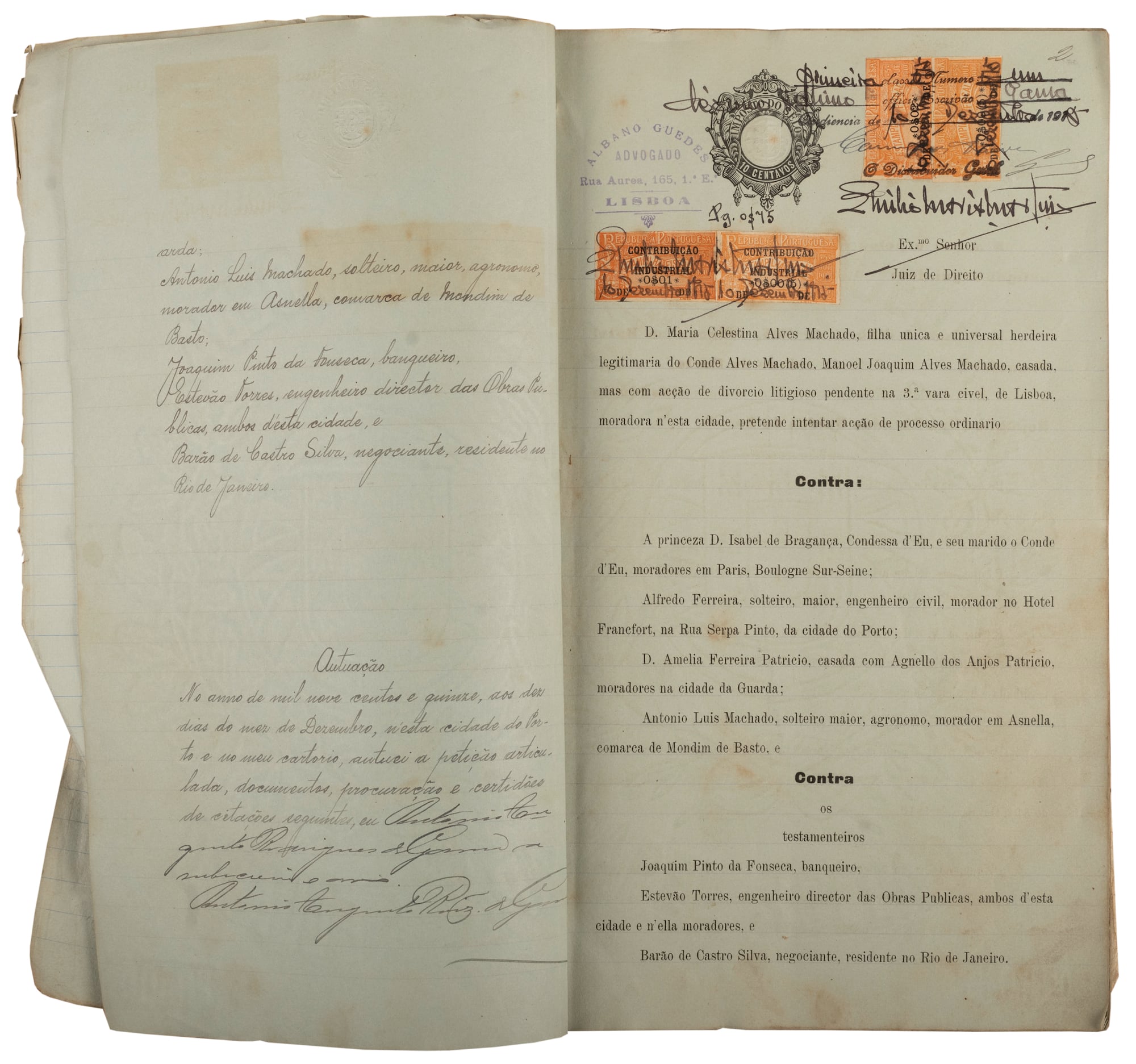 Proceso judicial de demanda ordinaria por testamento. Figura como demandante la Sra. D.ª Maria Celestina Alves Machado, y, como demandados, la princesa D.ª Isabel de Braganza, condesa de Eu (princesa de Brasil) y su marido, el conde de Eu, y otros, así como los albaceas Joaquim Pinto da Fonseca, Estêvão Torres y el barón de Castro Silva. El proceso judicial tiene por objeto la anulación del último testamento otorgado por su padre, el conde Alves Machado, que es válido, dado que el 13 de diciembre de 1913, a los noventa y un años de edad, se nacionalizó brasileño «con la intención y la voluntad, al adquirir una nueva nacionalidad, de poder testar desheredando a la demandante, su hija». El 30 de noviembre de 1916, la demandante retira la demanda por el plazo de la transacción judicial en el inventario por defunción de mi padre y para poner fin a todas las cuestiones pendientes en las que yo sea demandante o demandada, relativas a la herencia de mi fallecido padre.